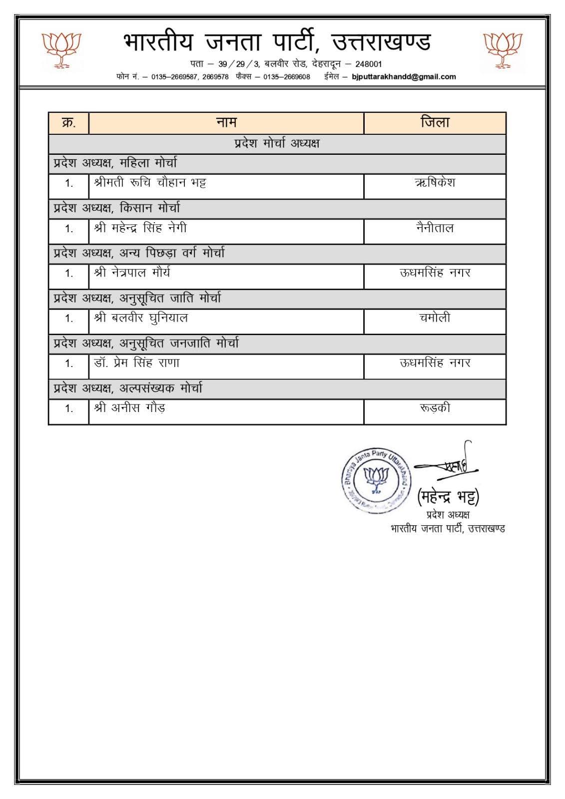देहरादून 14 सितंबर 2025। बड़ी खबर इस समय राजनीति से जुड़ी भी आ रही है जहां भाजपा ने उत्तराखंड में प्रदेश उपाध्यक्ष, प्रदेश महामंत्री, प्रदेश मंत्री, प्रदेश कोषाध्यक्ष, प्रदेश शहर कोषाध्यक्ष, प्रदेश कार्यालय सचिव, प्रदेश प्रकोष्ठ संयोजक, प्रदेश प्रकोष्ठ सहसंयोजक, प्रदेश मुख्य प्रवक्ता, प्रदेश मीडिया संयोजक, प्रदेश मीडिया सहसंयोजक, प्रदेश सोशल मीडिया संयोजक, प्रदेश सोशल मीडिया सहसंयोजक, प्रदेश आईआईटी संयोजक, प्रदेश मोर्चा अध्यक्ष की घोषणा कर दी है। आपको बता दे कि प्रदेश अध्यक्ष महेंद्र भट्ट ने आधिकारिक सूची जारी करने के साथ ही कई जिलों में नेताओं के चेहरे पर खुशियां लौट आई है, जिनकी सूची इस प्रकार है :-