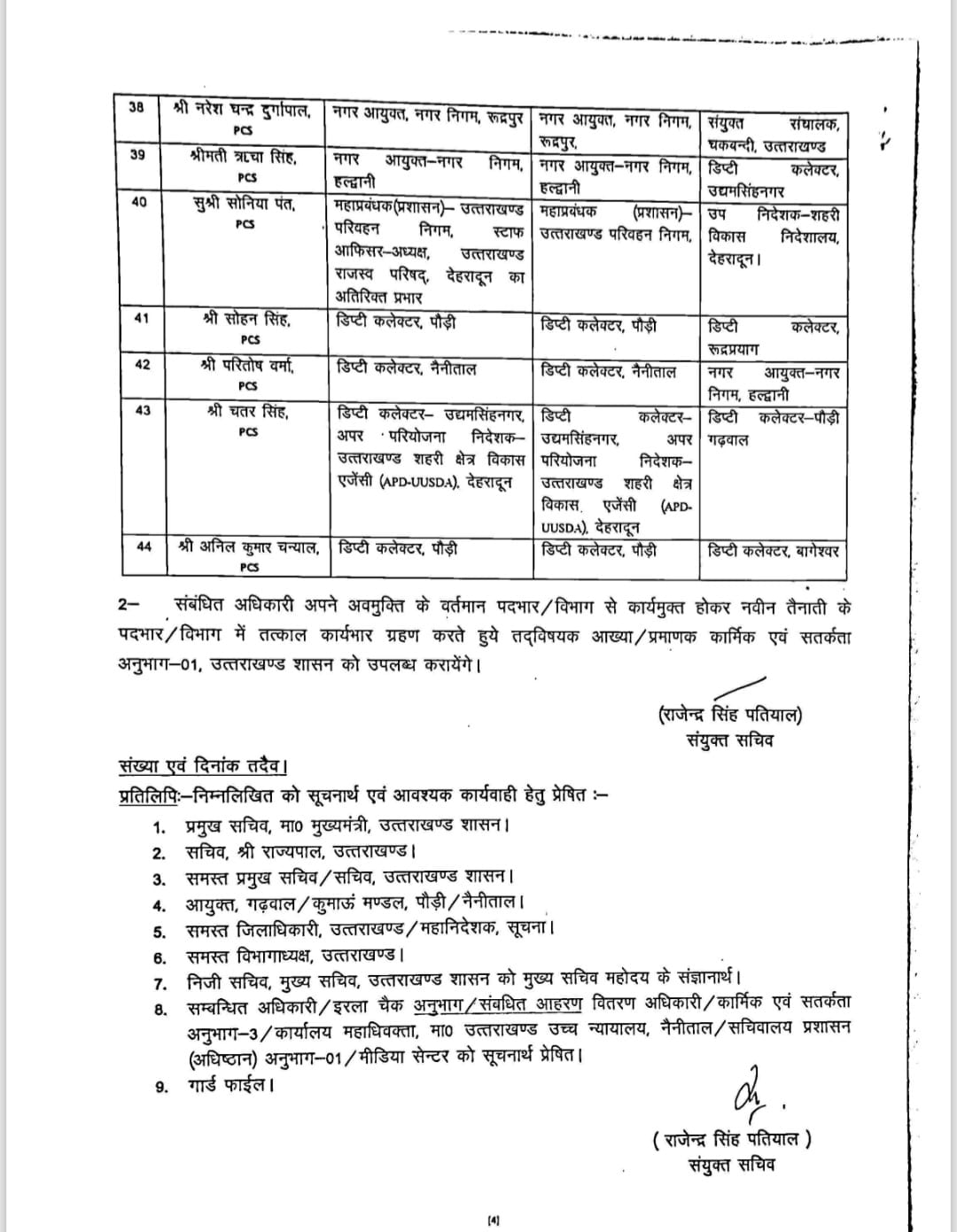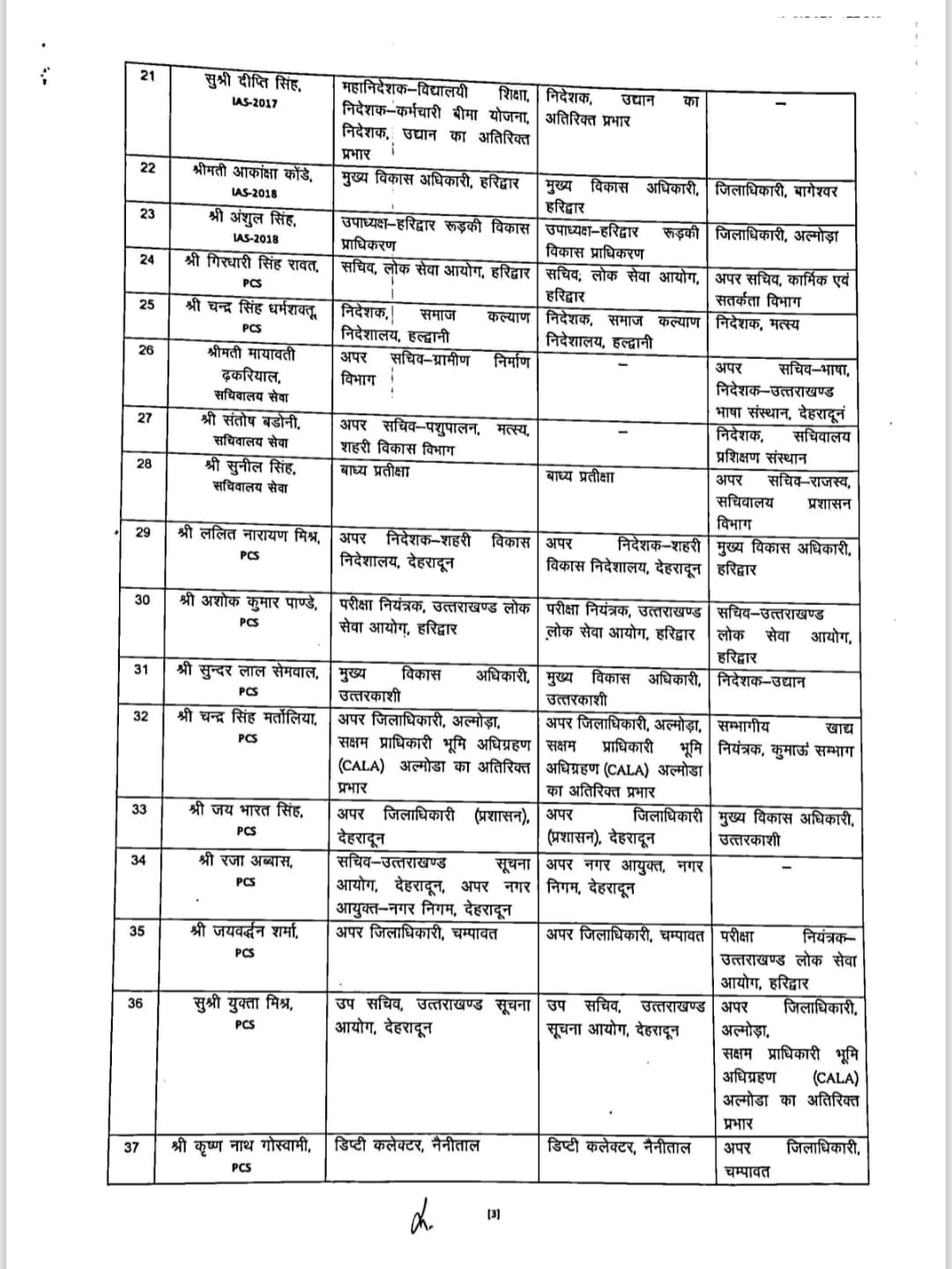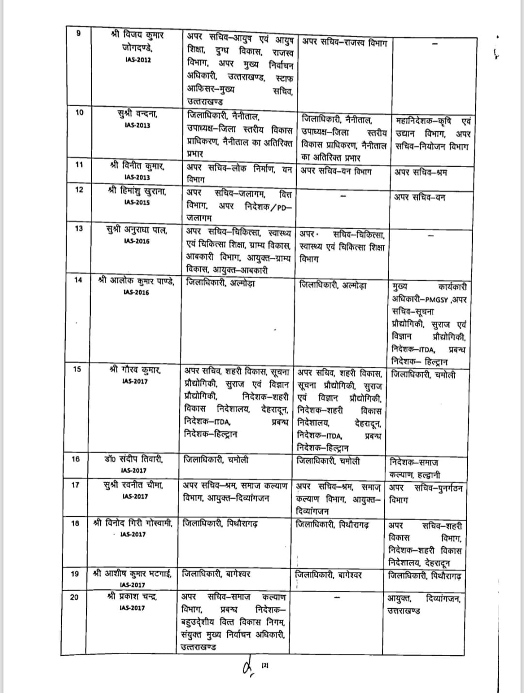 हरिद्वार 12 अक्टूबर 2025। उत्तराखंड शासन से इस वक्त बड़ी खबर सामने आ रही है, जहां उत्तराखंड में रविवार को उत्तराखंड शासन ने प्रदेश में 22 IAS तथा 18 पीसीएस अफसर के तबादले कर दिए हैं। आपको बता दे की हरिद्वार रुड़की विकास प्राधिकरण के उपाध्यक्ष अंशुल सिंह को अल्मोड़ा का डीएम बनाया गया है। वही हरिद्वार रुड़की विकास प्राधिकरण का उपाध्यक्ष कुंभ मेला अधिकारी सोनिका को बनाया गया है। वही हरिद्वार की मुख्य विकास अधिकारी आकांक्षा कोड़े को बागेश्वर का डीएम बनाया गया है। जारी की गई सूची इस प्रकार है :-