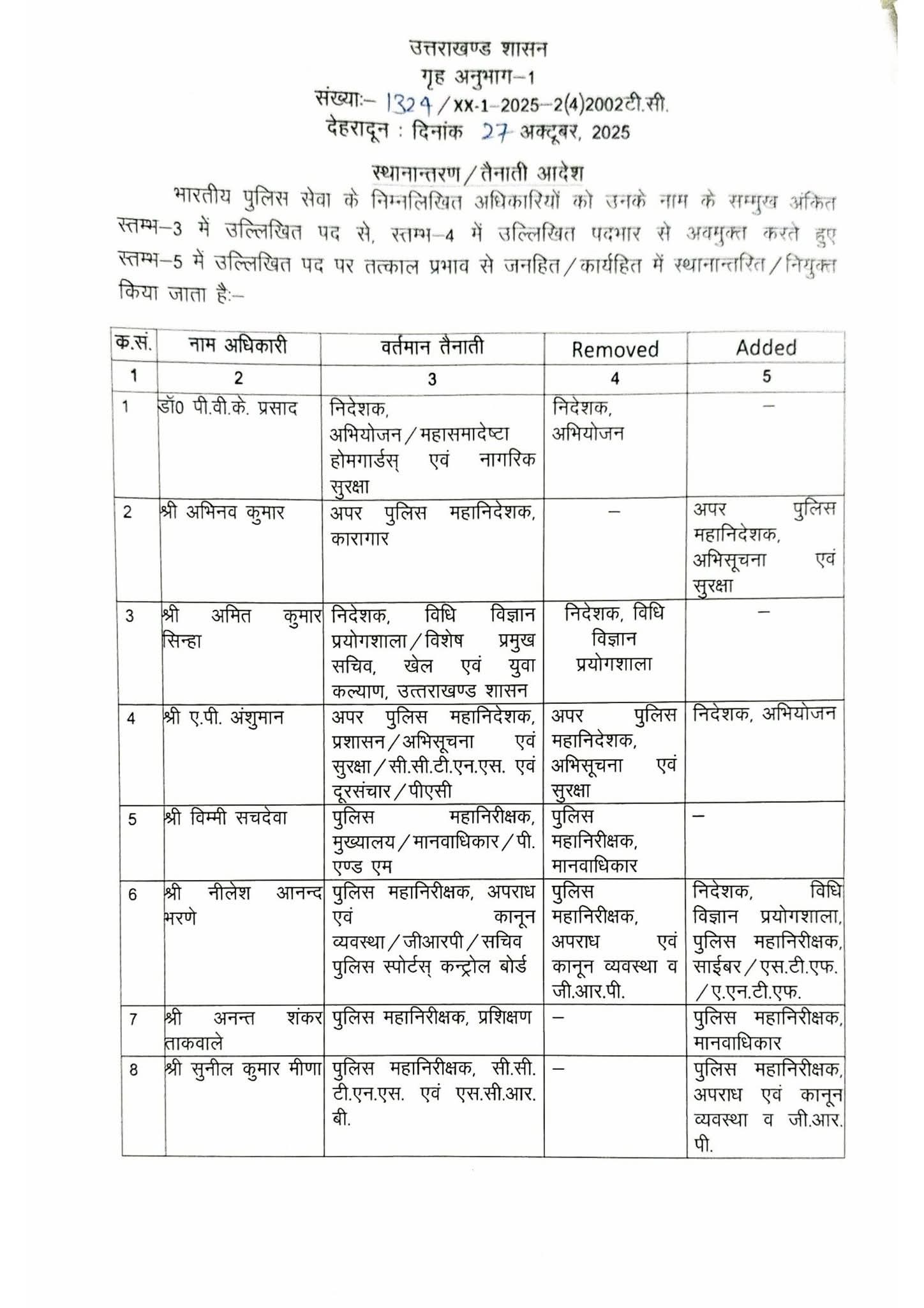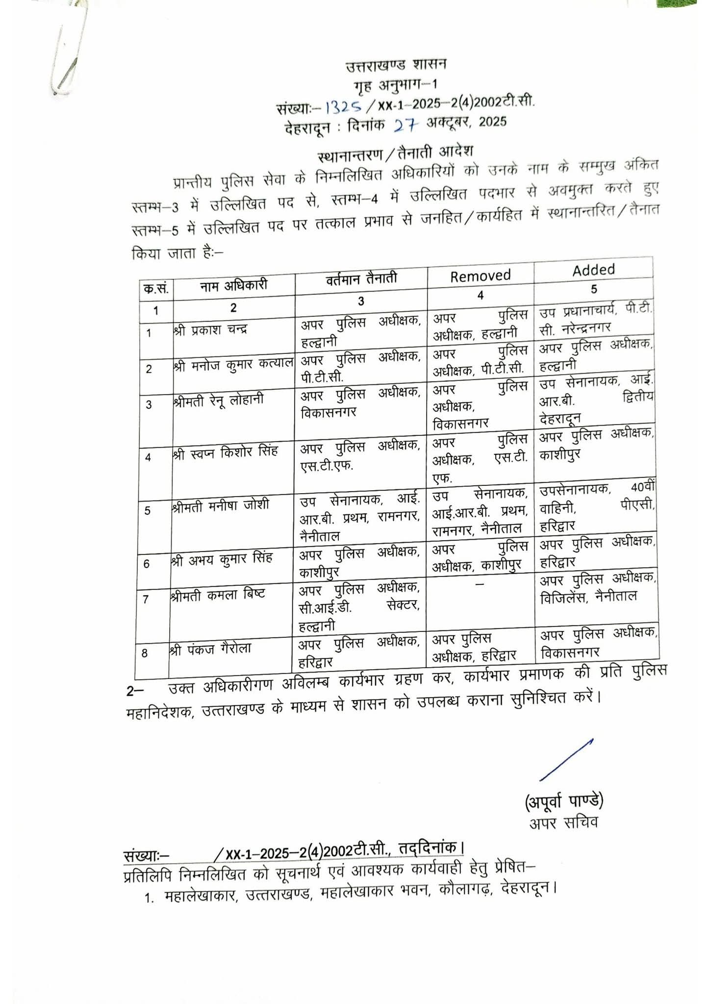बड़ी खबर इस समय उत्तराखंड पुलिस विभाग से आ रही है, जहां पर प्रदेश में आईपीएस और पीपीएस अधिकारियों के तबादले कर दिए गए हैं। सोमवार को जारी हुई सूची के अनुसार प्रदेश में 16 आईपीएस और आठ पीपीएस अधिकारियों के तबादले कर दिए गए हैं। जिसमें कुछ जिलों के पुलिस कप्तान भी बदले गए हैं जिनकी सूची इस प्रकार है :-