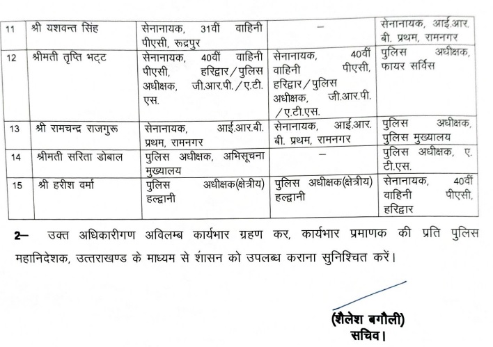 उत्तराखंड पुलिस विभाग से इस वक्त बड़ी खबर सामने आ रही है, शासन ने 15 आईपीएस अधिकारियों के तबादले कर दिए हैं, मिली जानकारी के मुताबिक 40 वाहिनी पीएसी की सेनानायक तृप्ति भट्ट को पुलिस अधीक्षक फायर सर्विस के पद पर तैनात किया गया है, वहीं एसएसपी देहरादून रहे अरुण मोहन जोशी को भी बड़ी जिम्मेदारी दी गई है, आपको बता दें कि अरुण मोहन जोशी को पुलिस महानिरीक्षक सीआईडी बनाया गया है, 15 आईपीएस के तबादले के साथ ही उनके आदेश जारी कर दिए गए हैं जो इस प्रकार हैं :-